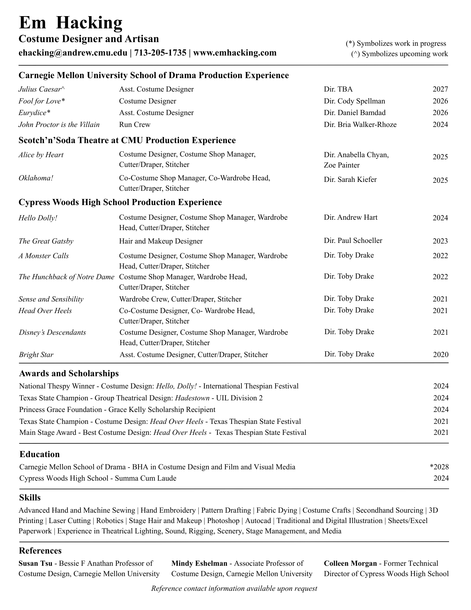 I am currently Pursuing a BHA in Costume Design and Film Studies at Carnegie Mellon University